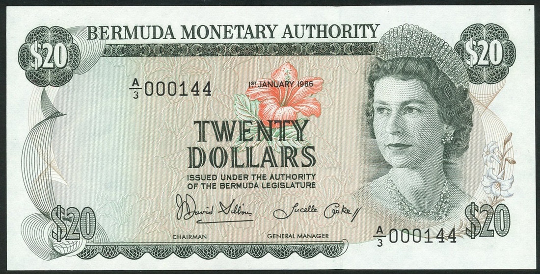 Bermuda Monetary Authority, $20, serial number A/3 000144, 1 January 1986, olive green, portrait Queen Elizabeth II at right, hibiscus flower at centre, value in each corner and at centre, reverse, coat of arms top left, Somerset Bridge at centre