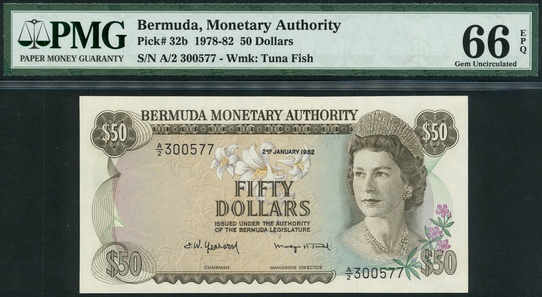 Bermuda Monetary Authority, $50, 2 January 1982, serial number A/2 300577, brown on multicolour underprint, portrait Queen Elizabeth II at right, bank title top centre, value in each corner and at centre, easter lily flowers, reverse, lighthouse at centre left, map of islands top right, arms low centre right