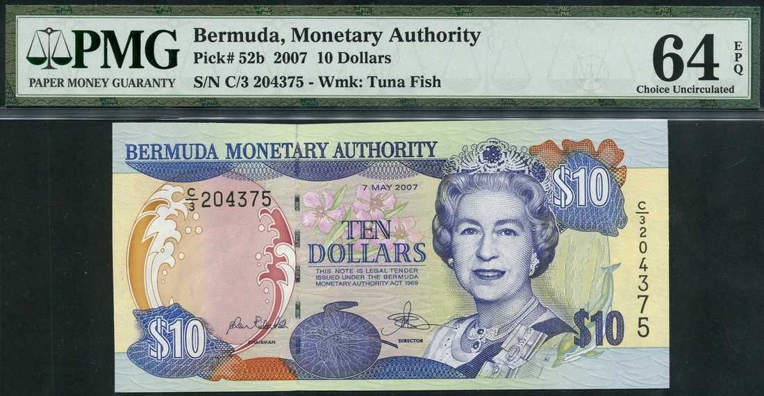 Bermuda Monetary Authority, $10, 7 May 2007, serial number C/3 204375, blue on multicolour underprint, portrait Queen Elizabeth II at right, bank title top centre left, oleander flowers at centre, reverse, shoreline, helmet snail shell, Bermuda petrel bird