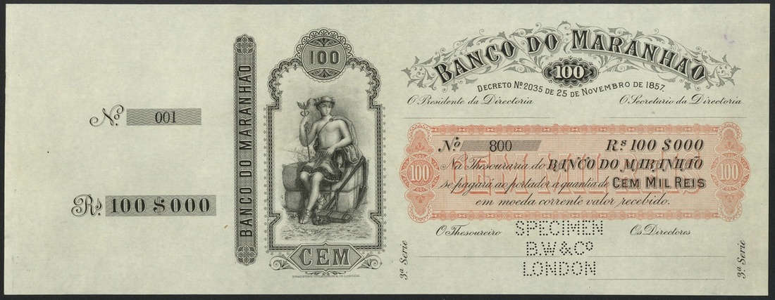 (†) Banco do Maranhao, Brazil, specimen 100 mil reis, 25 November 1857, serial number 001-800, black and white with a pale orange central panel, Mercury and symbols of Commerce at left, counterfoil at left