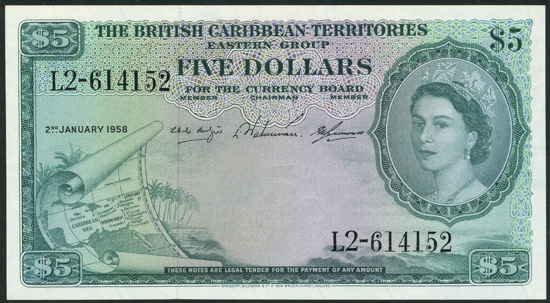 British Caribbean Territories, $5, 2 January 1958, serial number L2-614152, green on light green and lilac underprint, portrait Queen Elizabeth II in ornate circular frame at right, scroll with map of islands low left, reverse, five coats of arms