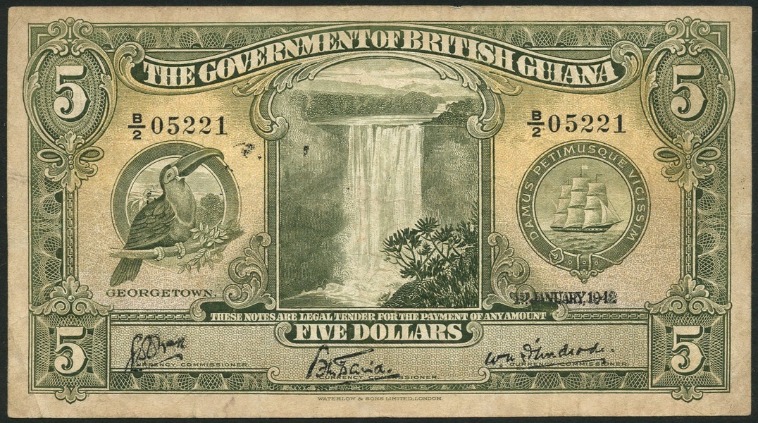 (x) Government of British Guiana, $1, 1 October 1938, serial number E/9 37424, red on multicolour underprint, $5, 1 January 1942, serial number B/2 05221, green on multicolour, both with toucan at left, sailing ship seal at right, waterfall at centre, value at each corner, Owen, MacDavid and d'Andrade signatures, reverse with George VI at centre, flanked by values