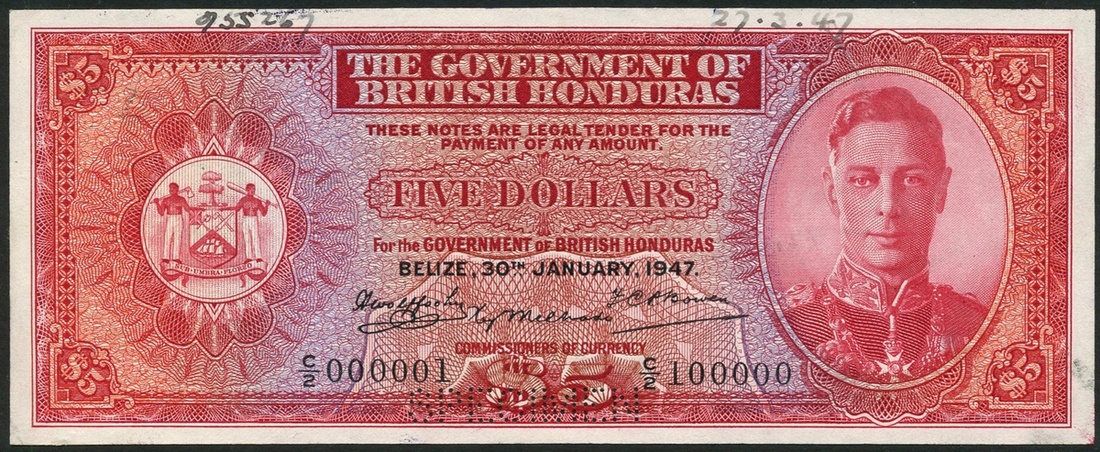 (†) Government of British Honduras, specimen $5, 30 January 1947, serial number C/2 000001-C/2 100000, red and mauve, George VI at right, arms at left, Wolffsohn, Melhado and Bowen signatures