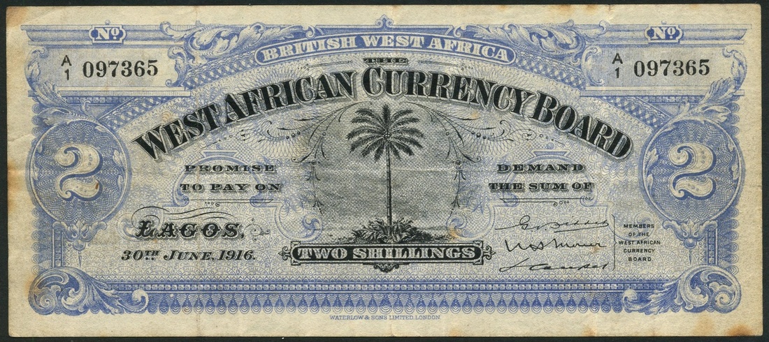 British West Africa, 2/-, Lagos, 30 June 1916, serial number A/1 097365, black on blue and white, palm tree at centre, signatures of Fiddes, Mercer and Couper