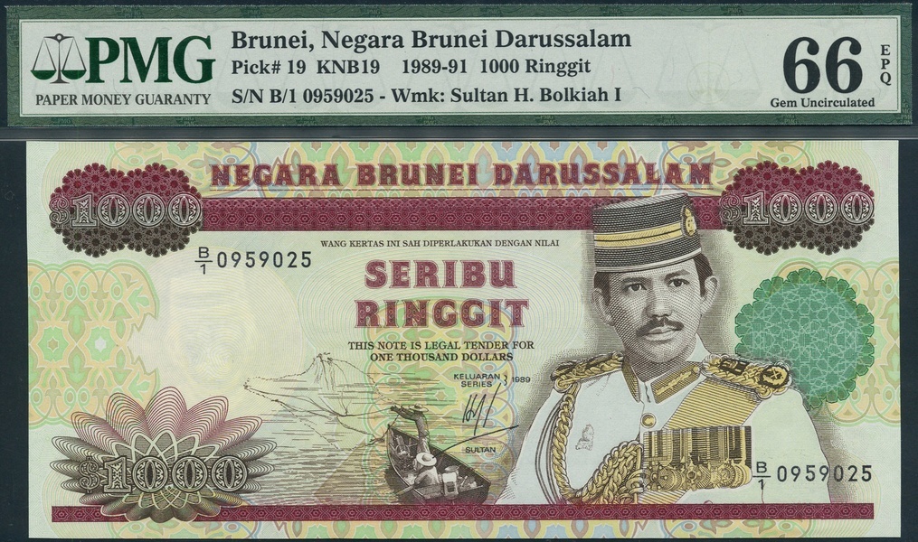 (x) Negara Brunei Darussalam, 1000 ringgit, 1989, serial number B/1 0959025, brown on multicolour underprint, portrait Sultan Hassanal Bolkiah Mu'izzaddin Waddaulah at centre right, fishermen in boat low centre, reverse, aerial view of water village and palace