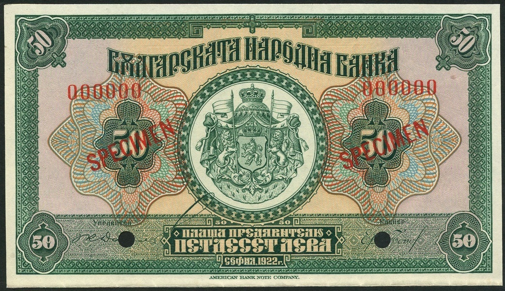 (x) Bulgarian National Bank, specimen 20 leva, 1922, red zero serial number, green, violet and blue, arms at top centre, specimen 50 leva, 1922, red zero serial number, green on multicolour underprint, arms at centre, red SPECIMEN overprint, hole punch