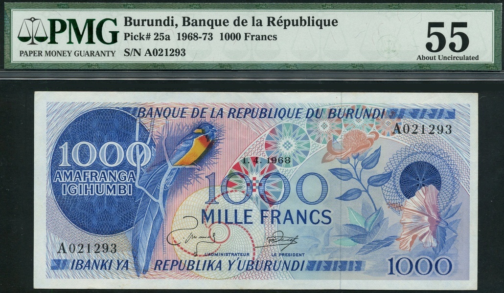 Banque de la Republic du Burundi, 1000 francs, 1968, serial number A 021293, blue on multicolour underprint, paradise whydah bird at centre left, protea and hibiscus flowers at right, reverse, Ankole-Watusi cattle, mountains in background