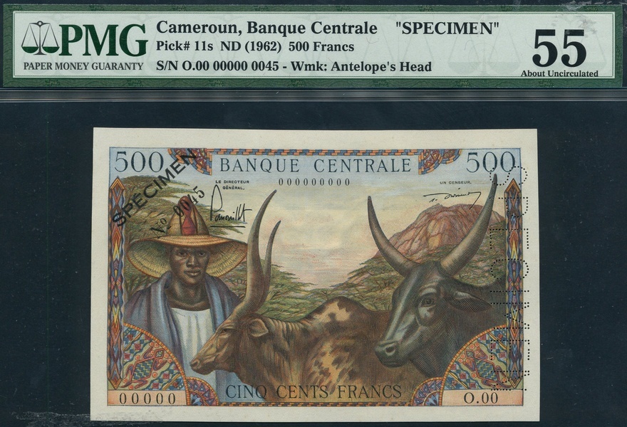Banque Centrale, Cameroun, specimen 500 francs, ND (1962), zero serial number, multicolour, man at left, cattle at centre and right, also Republique Unie du Cameroun, specimen 500 francs, ND (1974), serial number R.13 00000, woman at left, lizard at right, both with SPECIMEN overprints