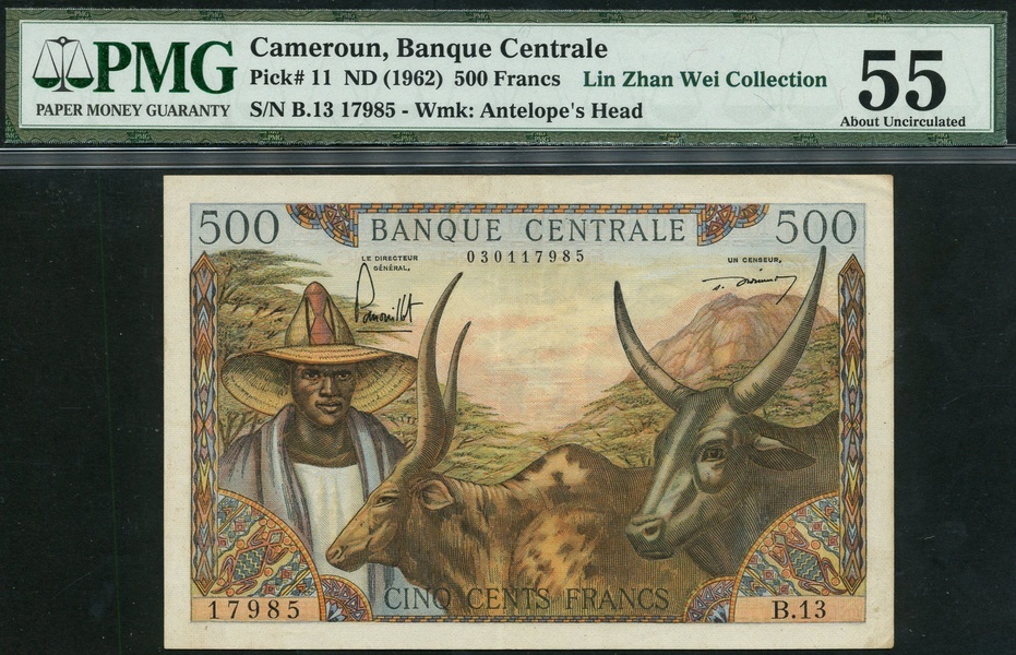 (x) Banque Centrale, Cameroun, 500 francs, ND (1962), serial number B.13 17985, multicolour, man at left, cattle, mountains in background, colourful panels at left and right, reverse, banana harvesting, cargo ships