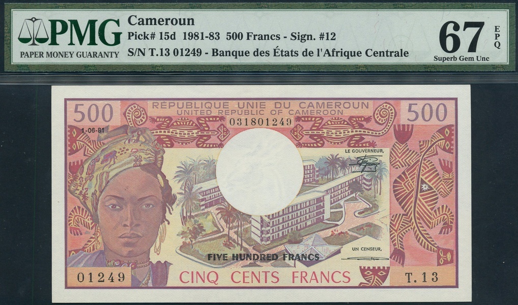 Republique Unie du Cameroun, 500 francs (3), 1974, 1978 and 1981, prefixes A.8, Z.10 and T.13, woman at left, native painting of lizard at right