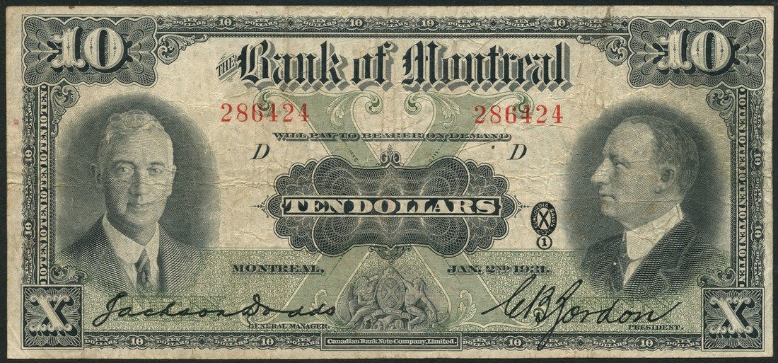 (x) Bank of Montreal, $10, 2 January 1931, serial number 286424, black on olive green underprint, portraits J Dodd at left and C B Gordon at right, reverse, bank building