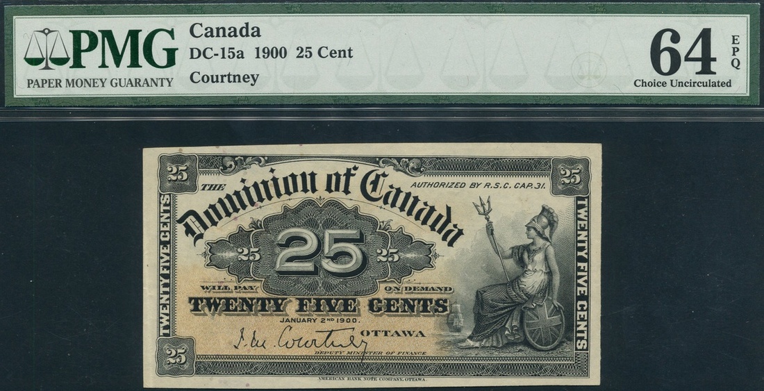 (x) Dominion of Canada, 25 cents, 2 January 1900, no serial number, black on light tan and white, seated Britannia at right, value in ornate tablet at centre left with bank title above, Courtney signature, reverse, value in green guilloche pattern