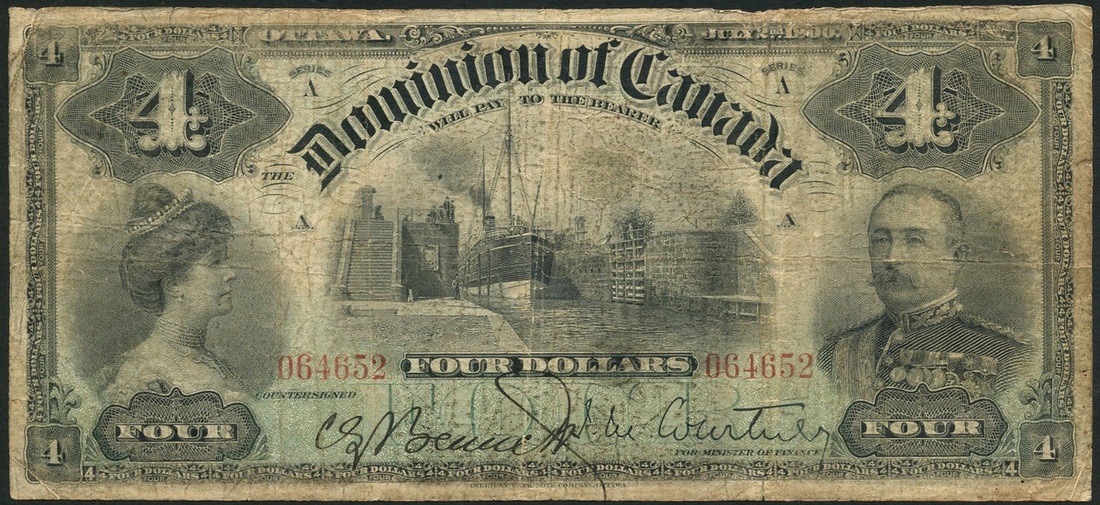 Dominion of Canada, $1, 31 March 1898, black and pale brown, logging at centre, $2, 2 July 1897, fishing boat at centre and $4, 2 July 1900, ship in lock at centre