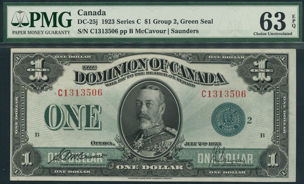 (x) Dominion of Canada, $1, 2 July 1923, serial number C1313506, black on light green underprint, portrait King George V at centre, bank title top centre value in border, arms at centre right, McCavour/Saunders signature, reverse, Library of Parliament