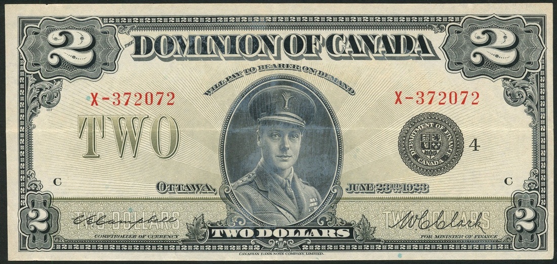 (x) Dominion of Canada, $2, 23 June 1923, serial number X-372072, black on olive green underprint, portrait Edward, Prince of Wales at centre flanked by value at left and arms at right, Campbell/Clark signature, reverse, olive green, arms at centre
