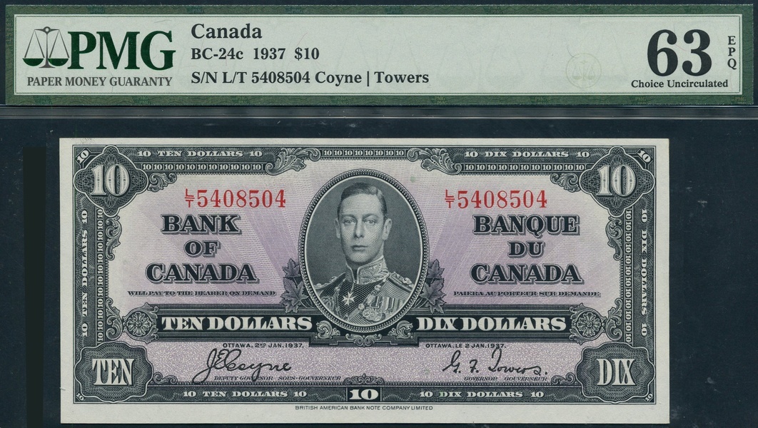 (x) Bank of Canada, $10 (2), 2 January 1937, serial numbers A/D2828484 and L/T5408504, black on light purple underprint, portrait King George VI at centre flanked by value in English at left and in French at right, Osborne/Towers signature, reverse, allegorical figure at centre
