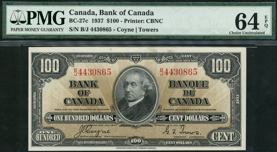 (x) Bank of Canada, $100, 1937, serial number B/J4430865, black on light brown underprint, portrait Sir John MacDonald at centre flanked by value in English at left and French at right, value in border and at low left and right, Coyne/Towers signature, reverse, allegorical figures at centre
