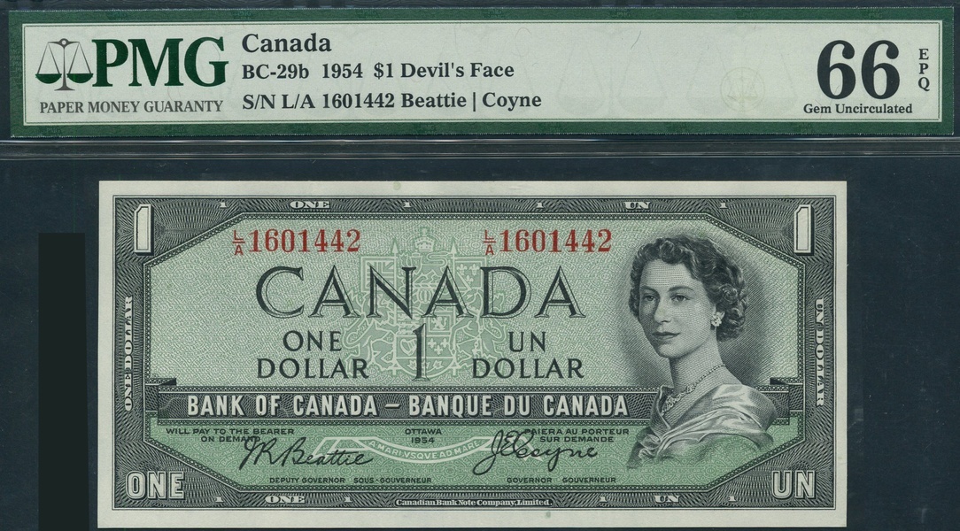 (x) Bank of Canada, $1 (2), 1954, serial numbers H/A0919947 and L/A1601442, dark grey on green underprint, portrait Queen Elizabeth II at right, value at centre and in border around, Coyne/Towers and Beattie/Coyne signatures respectively, reverse, prairie