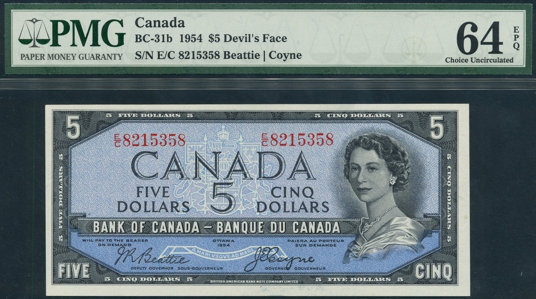 (x) Bank of Canada, $5, 1954, serial number E/C8215358, dark grey on blue underprint, portrait Queen Elizabeth II at right, value in border around and in panel at low centre, Beattie/Coyne signature, reverse, Otter Falls