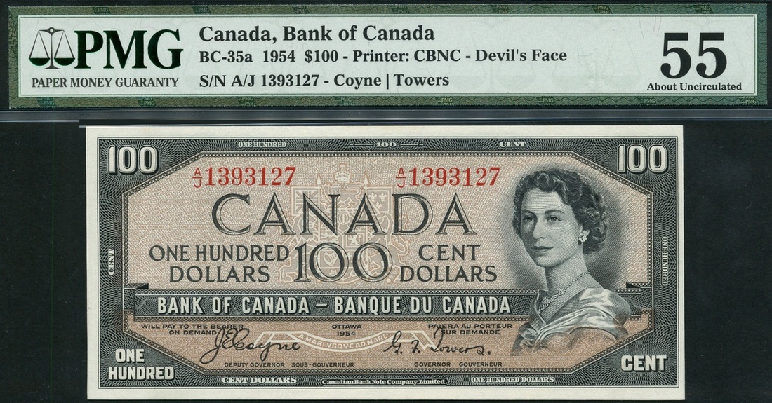 (x) Bank of Canada, $50 and $100, 1954, serial numbers A?H 0774249 and A/J 1393127, grey on light orange underprint and light tan underprint respectively, both feature portrait Queen Elizabeth II at right, value in each corner and at centre, bank title in dark tablet across low centre, reverses, coastline in Lockeport and Okanagan Lake in British Columbia