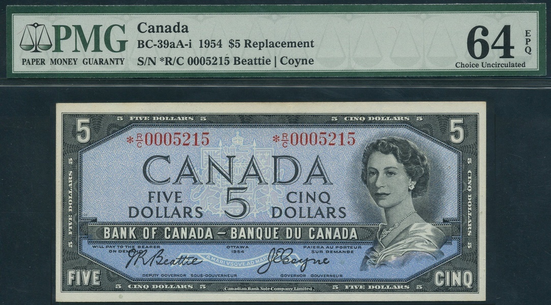(x) Bank of Canada, replacement $5, 1954, serial number *R/C0005215, dark grey on blue underprint, portrait Queen Elizabeth II at right, bank title in panel low centre, value in border, Beattie/Coyne signature, reverse, river flowing through trees
