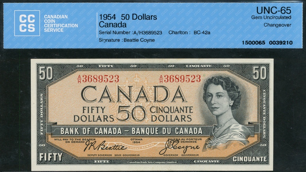 (x) Bank of Canada, $50, 1954, serial number A/h3689523, dark grey on light orange underprint, portrait Queen Elizabeth II at right, value in border around and in panel at low centre, Beattie/Coyne signature, reverse, coastline