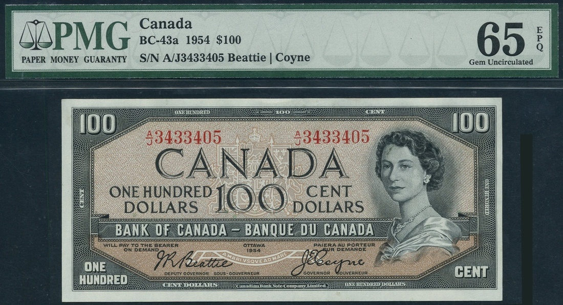 (x) Bank of Canada, $100, 1954, serial number A/J3433405, dark grey on light tan underprint, portrait Queen Elizabeth II at right, value in panel low centre and in border around, Beattie/Coyne signature, reverse, Okanagan Lake, British Columbia