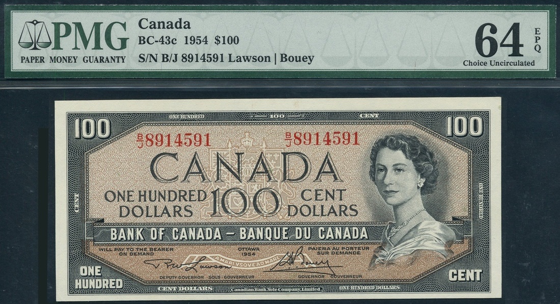 (x) Bank of Canada, $100, 1954, serial number B/J8914591, dark grey on light tan underprint, portrait Queen Elizabeth II at right, value in panel low centre and in border around, Lawson/Bouey signature, reverse, Okanagan Lake, British Columbia