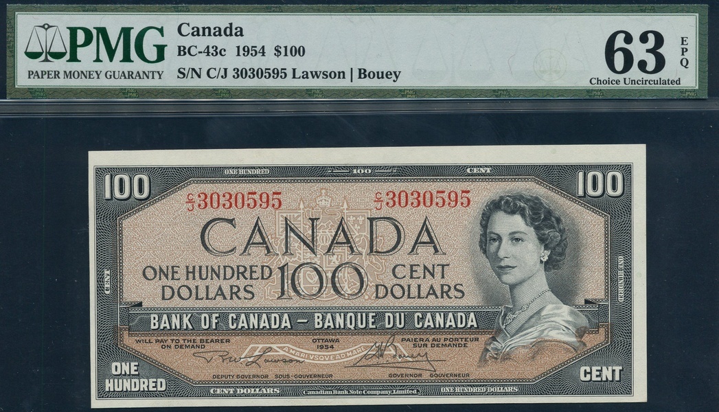 (x) Bank of Canada, $100, 1954, serial number C/J3030595, dark grey on light tan underprint, portrait Queen Elizabeth II at right, value in panel low centre and in border around, Lawson/Bouey signature, reverse, Okanagan Lake, British Columbia