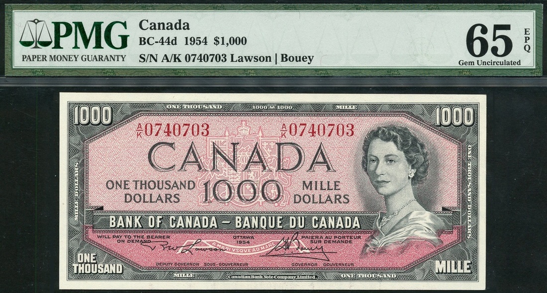 Bank of Canada, $1000, 1973-84, serial number A/K 0740703, black on light pink underprint, portrait Queen Elizabeth II at right, value in each corner and at centre, bank title in panel at centre in English and French