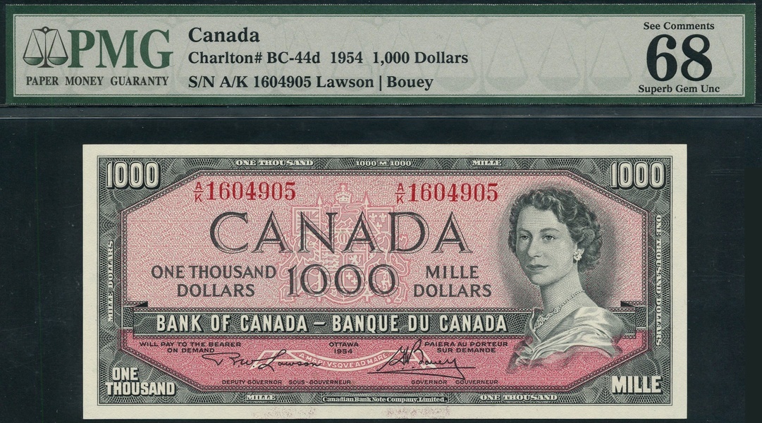 (x) Bank of Canada, $1000, 1954, serial number A/K1604905, dark grey on pink underprint, portrait Queen Elizabeth II at right, bank title in English and French in panel at low centre, Lawson/Bouey signature, reverse, landscape scene