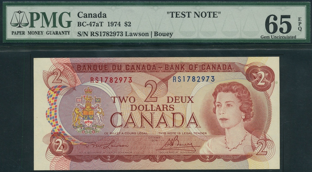 (x) Bank of Canada, $2 test note, 1974, serial number RS1782973, maroon and multicolour, portrait Queen Elizabeth II at right, arms at left, bank title in English and French top along top, value in each corner and at centre, Lawson/Bouey signature, reverse, Inuit tribesmen