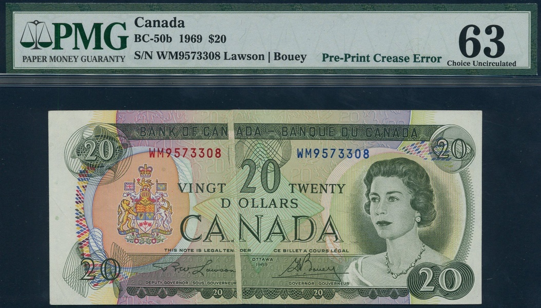 (x) Bank of Canada, ERROR: $20, 1969, serial number WM9573308, green on multicolour underprint, portrait Queen Elizabeth II at right, arms at left, Lawson/Bouey signature, reverse, Lake Moraine and Rocky Mountains