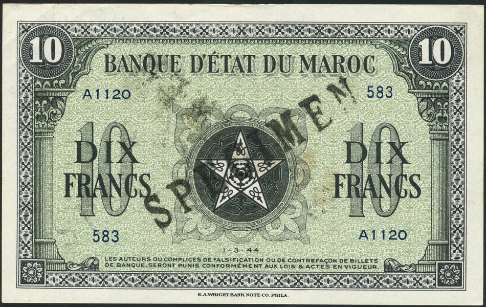 (x) Banque d'Etat du Maroc, 10 francs, 1 March 1944, serial number A1120 582, black on green underprint, Seal of Solomon at centre flanked by value in numerals and text, columns at left and right, reverse, blue and pink, ornate border