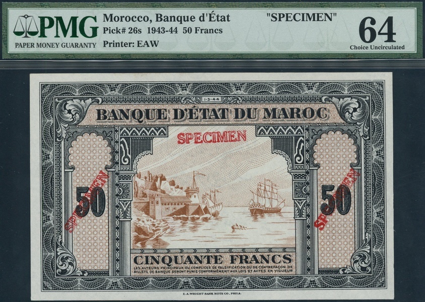 Banque d'Etat du Maroc, specimen 50 francs, 1943, no serial number, black on light brown, fortress and sailing ship at centre, flanked by denomination, reverse green and yellow, red SPECIMEN overprint