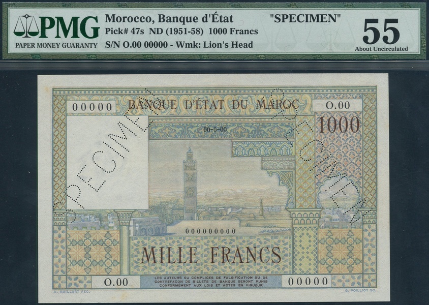 Banque d'Etat du Maroc, specimen 1000 francs, ND (1951), zero serial number, multicolour, minaret of the Koutoubia mosque in Marrakech, reverse buildings in Rabat, perforated SPECIMEN