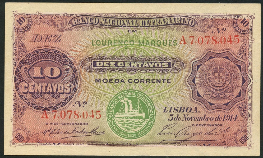 Banco Nacional Ultramarino, Mozambique, 10 centavos, 5 November 1914, serial number A 7,078,045, purple on light pink and green underprint, bank title top centre, value in ornate tablet at left, arms at right, ship seal type III low centre, also, 500 escudos, 22 March 1967, serial number 1334252, purple on multicolour underprint, portrait Caldas Xavier at right, bank title top centre with arms below
