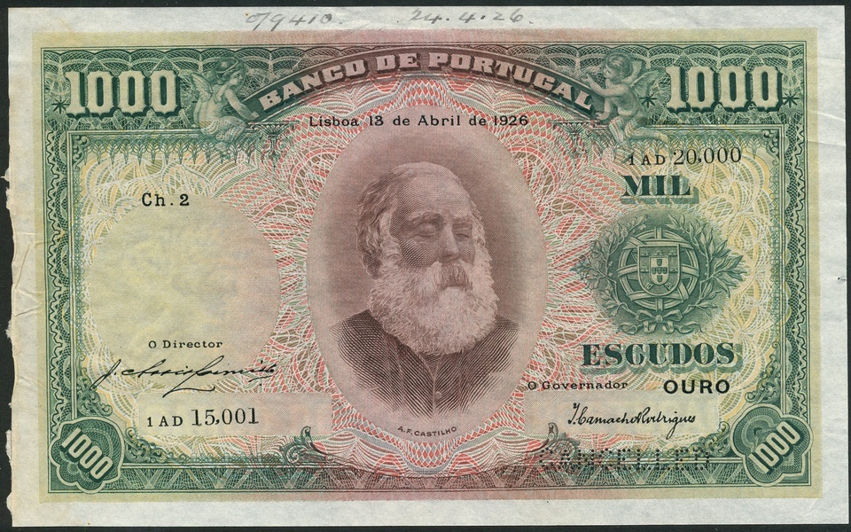 (†) Banco de Portugal, specimen 1000 escudos, 13 April 1926, serial number 1AD 15001-1AD 20000, green and multicoloured, Castilho at centre, arms at right, reverse blue and purple, maidens at centre, cherub top left and right