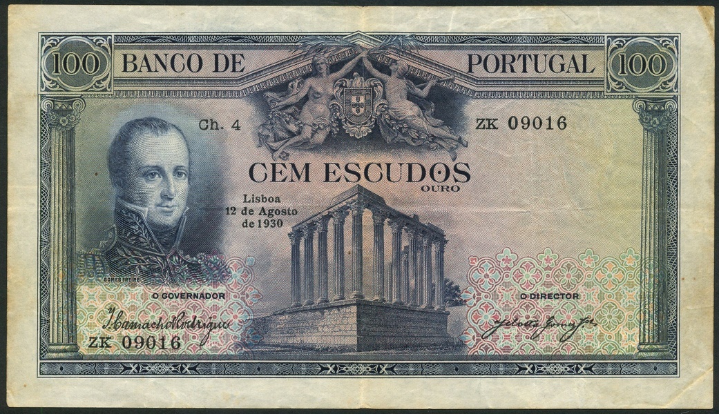 Banco de Portugal, 100 escudos, 12 August 1930, serial number ZK 09016, grey blue on multicolour underprint, portrait G Freire at left, columns at far left and right, arms top centre flanked by allegorical figures, reverse, brown, horses and cart at centre, town in background