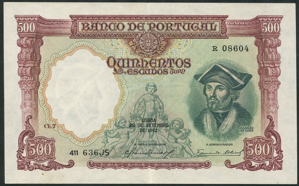 Banco de Portugal, 500 escudos, 29 September 1942, serial number R 08604, brownish purple on blue green underprint, portrait Damiao de Goes at right, bank title and arms top centre, ornate columns at left and right, cherubs low centre, reverse, pulpit of Coimbra's Santa Cruz Church at centre