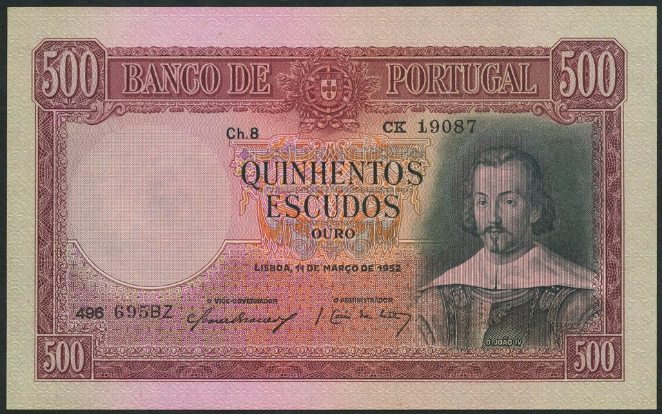 Banco de Portugal, 500 escudos, 11 March 1952, serial number CK 19087, red on multicolour underprint, portrait D Joao IV at right, bank title and arms top centre, value in each corner and at centre, reverse, King surrounded by people