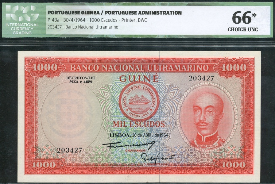 Banco Nacional Ultramarino, Portuguese Guinea, 1000 escudos, 30 April 1964, serial number 203427, red on multicolour underprint, portrait Honorio Barreto at right, ship seal at centre, value in each corner and at centre, reverse, woman looking out at ship at sea