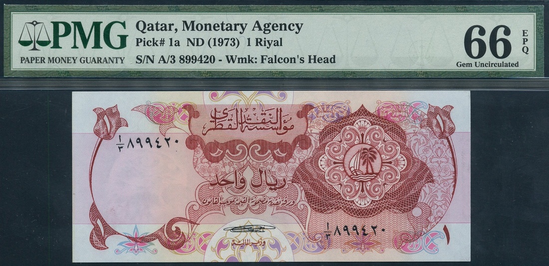 (x) Qatar Monetary Agency, 1 riyal (3), ND (1973), consecutive serial numbers A/3 899420/2, reddish brown, arms at right, ornate patterns in background, reverse, port of Doha at left