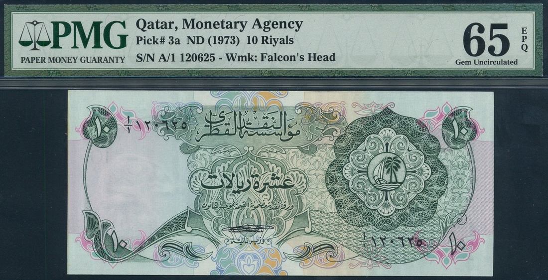 (x) Qatar Monetary Agency, 10 riyals, ND (1973), consecutive serial numbers A/1 120624/5, green on multicolour underprint, arms at right, value in each corner, patterned background, reverse, Qatar Monetary Agency headquarters