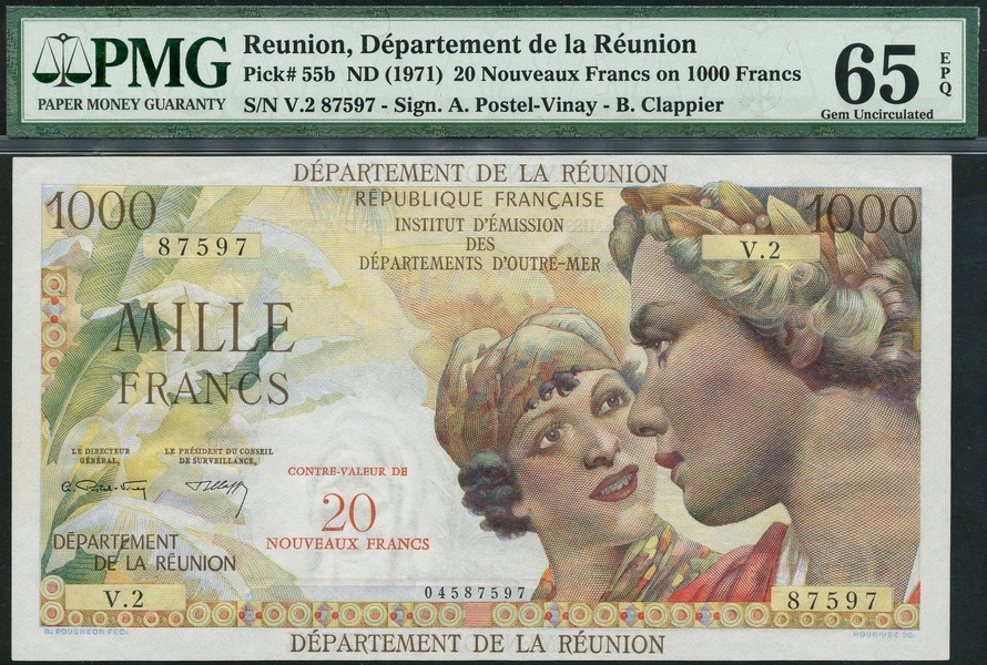 (TBB B107, Pick 55b), in PMG holder number 65, EPQ, gem uncirculated. Stunning note in a fantastic grade. French banknote design at its most beautiful