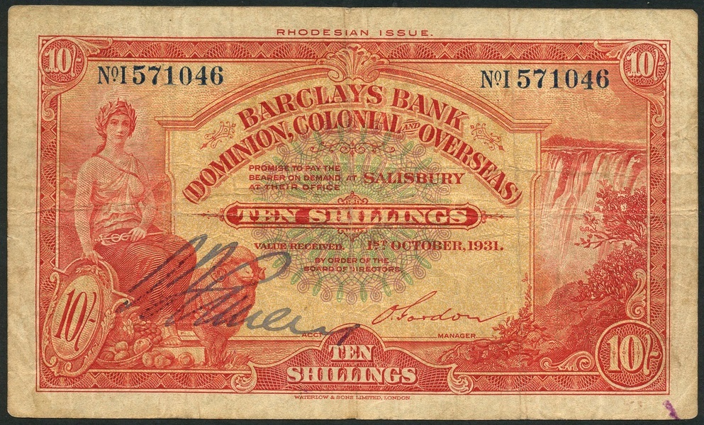 Barclays Bank (Dominion, Colonial and Overseas), Rhodesia, 10 shillings, Salisbury, 1 October 1931, serial number I 571046, red and yellow, a blue-green and lilac central guilloche, maiden and shield seated at left, falls at right, one printed signature of Gordon and one manuscript serial number, reverse red and yellow, lion reclining low centre, value at each corner
