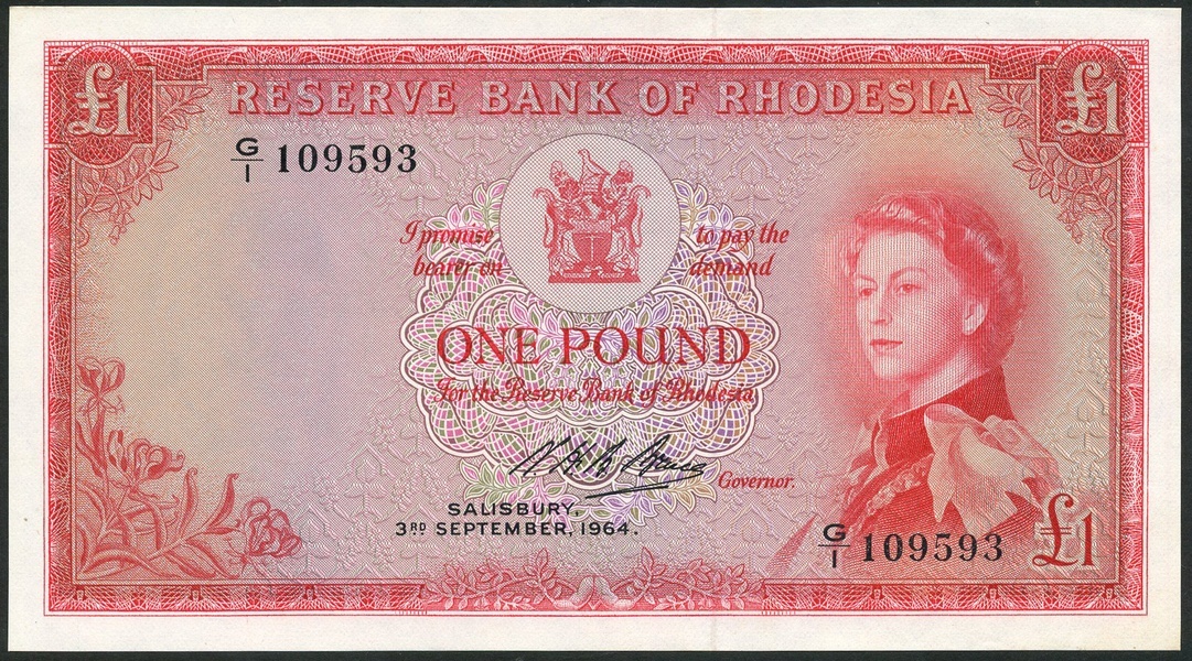 Reserve Bank of Rhodesia, £1, 3 September 1964, serial number G/I 109593, red on pale violet underprint, portrait Queen Elizabeth II at right, bank title top centre with arms below, reverse, Victoria Falls at centre, value in each corner and low centre