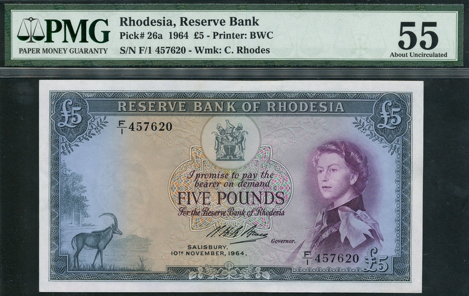 Reserve Bank of Rhodesia, £5, 12 November 1964, serial number F/1 457620, purple on multicolour underprint, portrait Queen Elizabeth II at right, arms top centre, sable antelope low left, reverse, Great Zimbabwe ruins