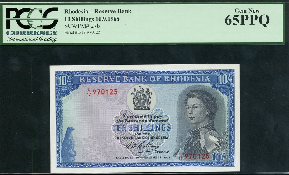 Reserve Bank of Rhodesia, 10 shillings, 10 September 1968, serial number L/17 970125, blue on multicolour underprint Elizabeth II at right, arms at top centre