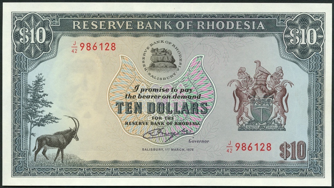 Reserve Bank of Rhodesia, a set of same date issue in original folder, 1 March 1976, comprising, $1, blue, $2, red, $5, brown, $10, grey, all feature arms at right, arms top centre, reverses, tobacco field, Victoria Falls, ,lion and lioness and Great Zimbabwe ruins respectively